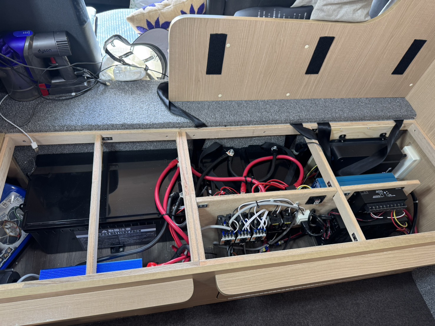 排熱ファンやポータブル電源からサブバッテリーへの電源供給口も設置させていただきました
