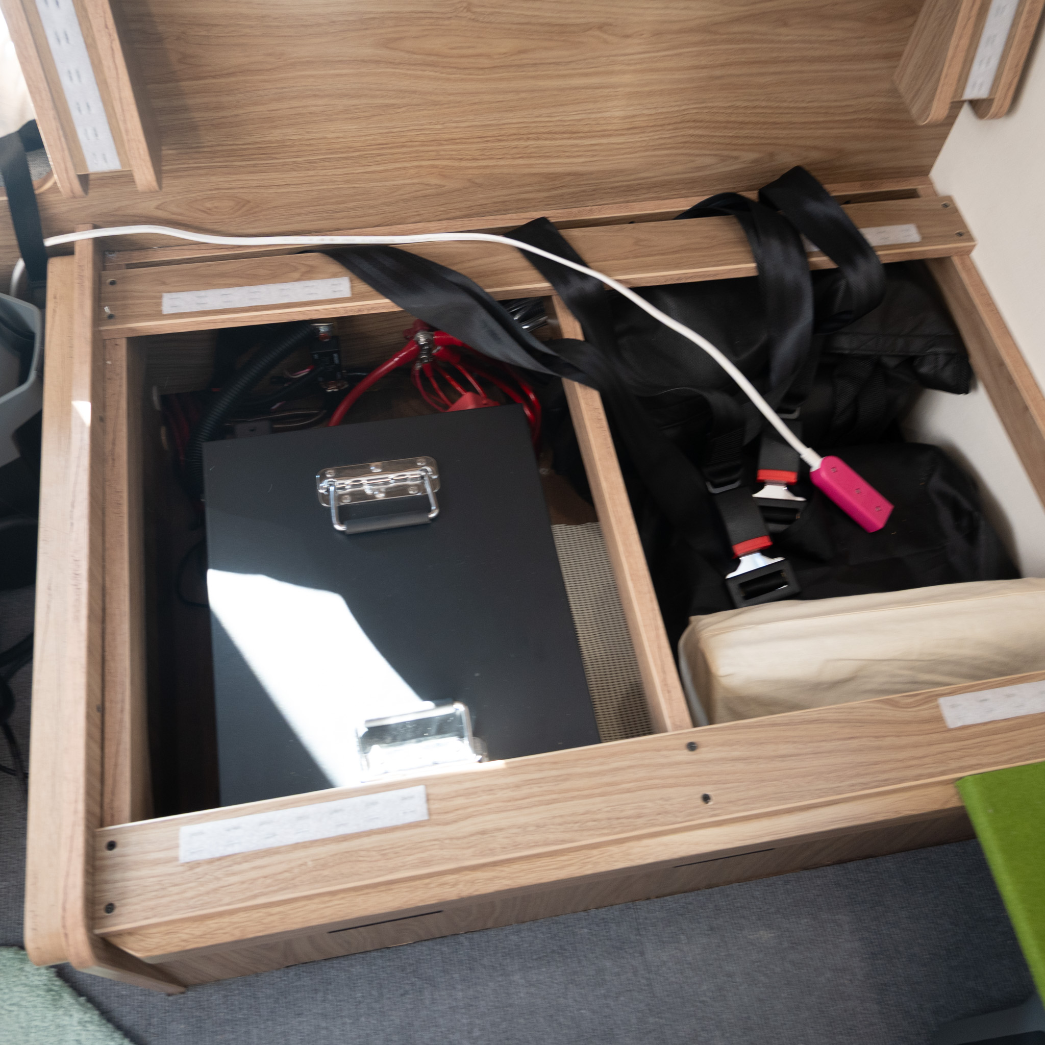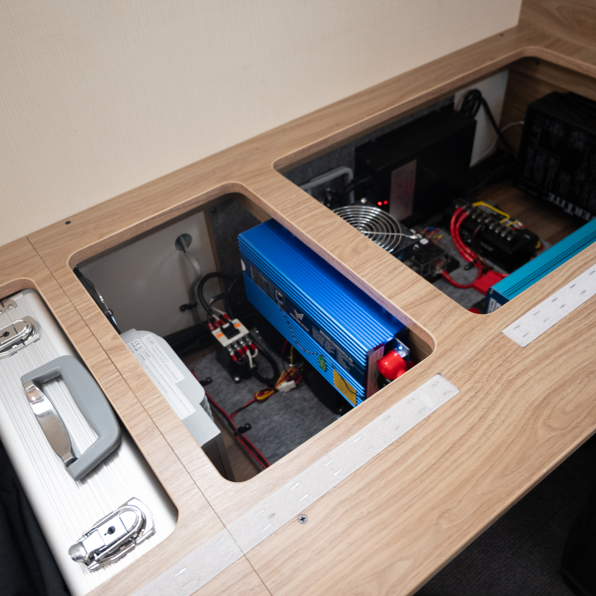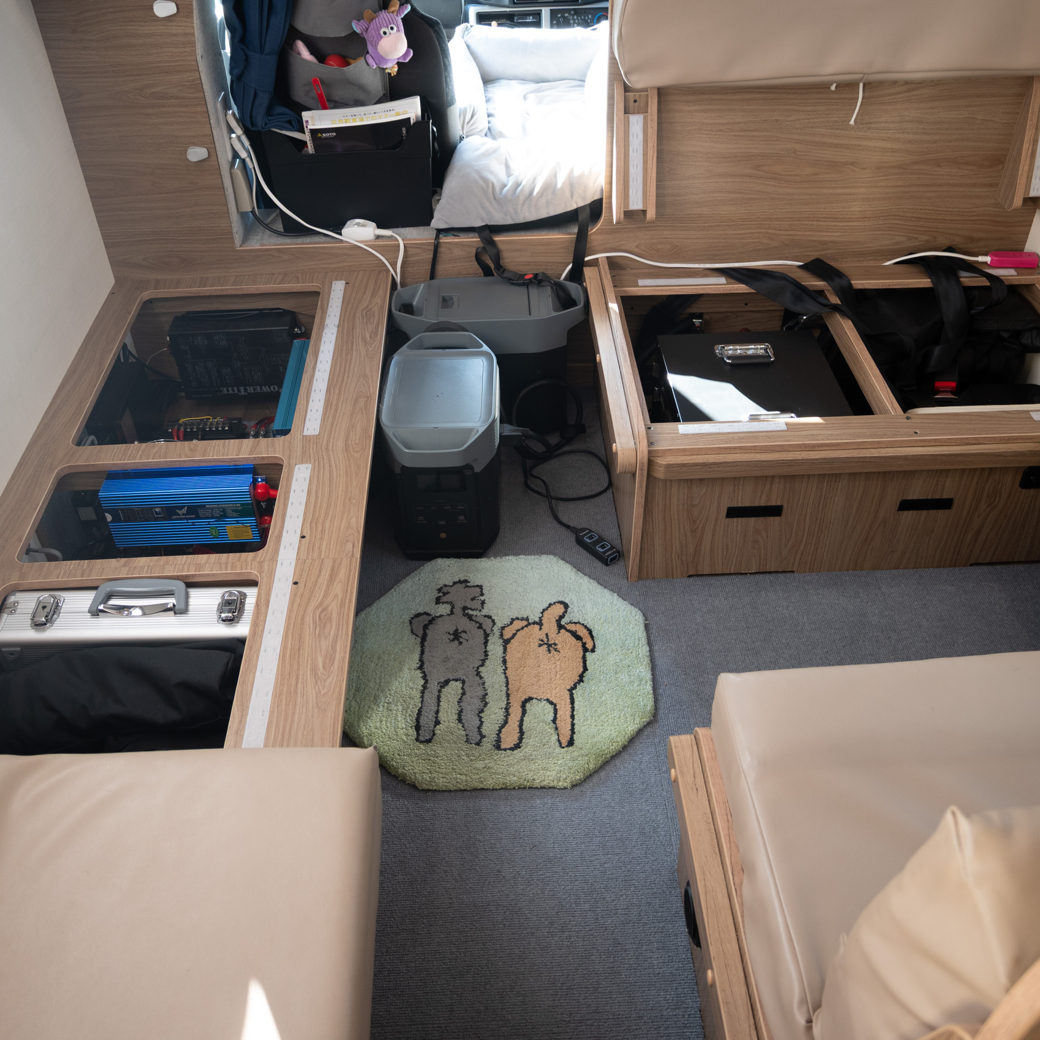 スペースの都合で多くのバッテリーを積載できなくとも 当社のバッテリーなら省スペースで620Ahバッテリーを搭載し余裕のあるキャンピングカーライフを提案できます。 あわせて走行充電器も「MOVING CHARGER12-80」を搭載させていただき、走行充電電流も純正の3倍ほどになりました。