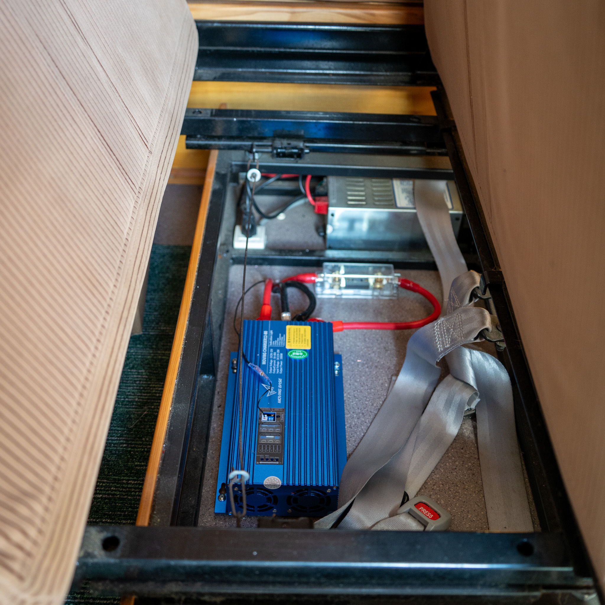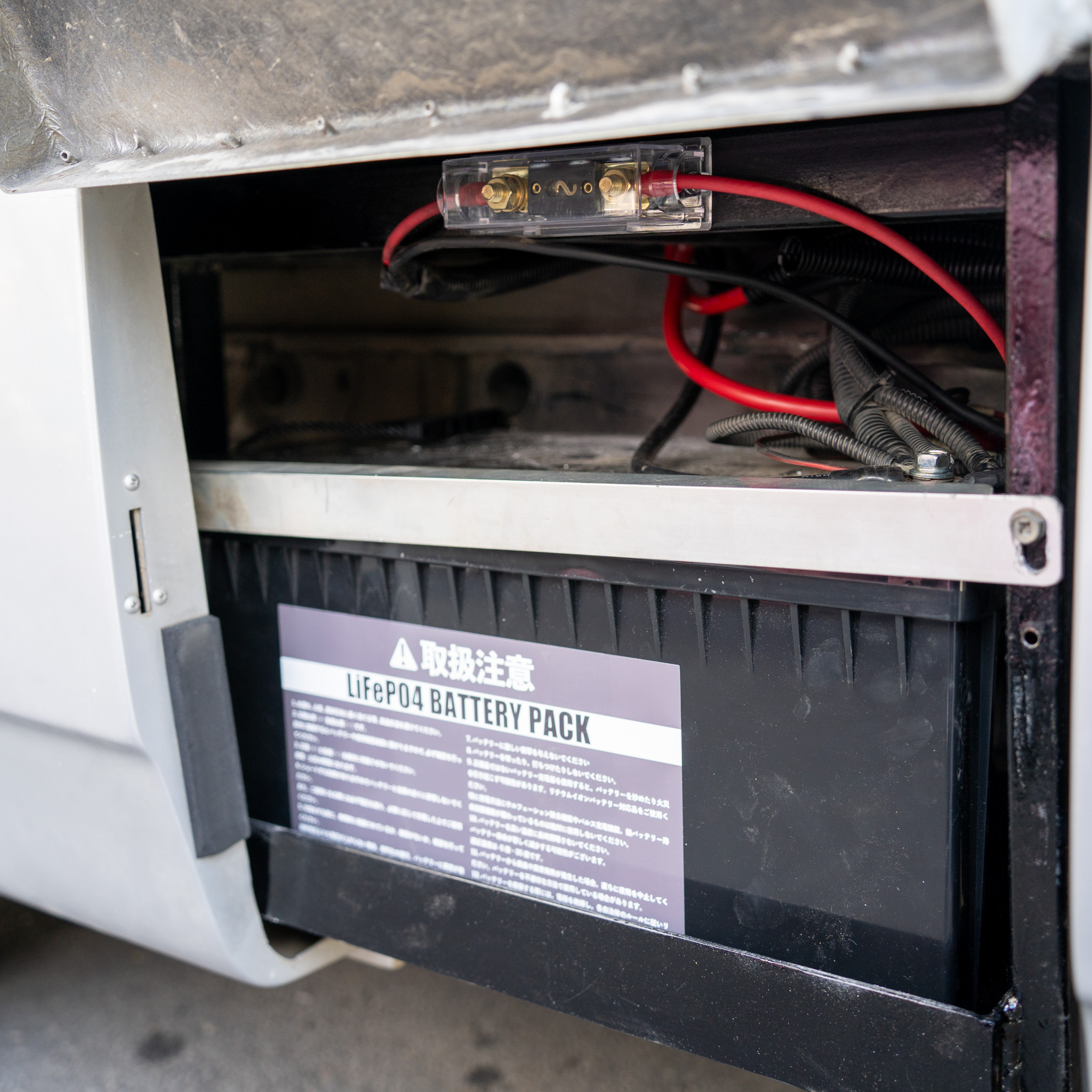 車内のバッテリーの搭載スペースが少ない車両であったため、お客様の方で、バッテリーの架台を制作していただき、入庫していただきました。